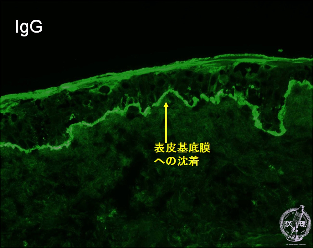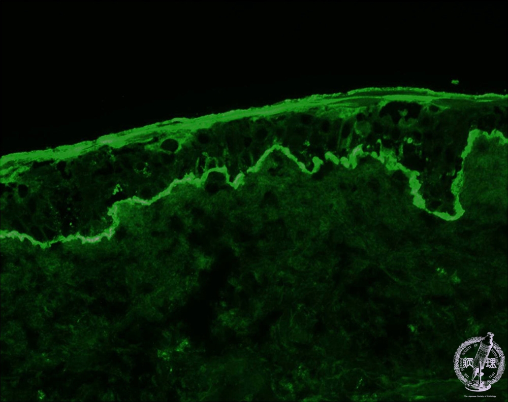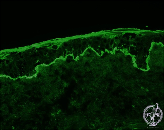 Microscopic image (Bullous pemphigoid): Linear IgG and C3 depositions are seen along the basement membrane.