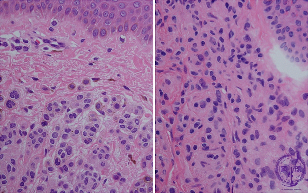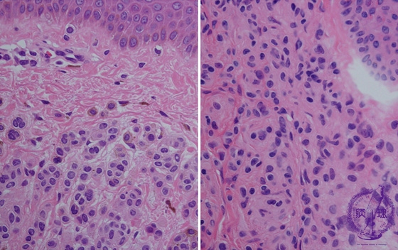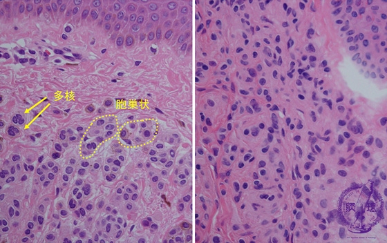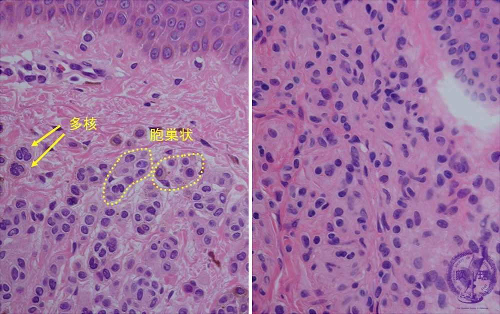 Nevus cells form nests at the superficial dermis. Sometimes multinuclear nevus cells also exist (left). At the deep dermis, smaller nevus cells scatter. Cytoplasmic border of the nevus cells are obscure.