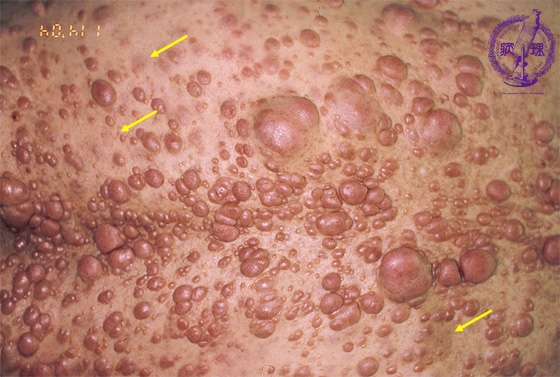 Macroscopic findings (von Recklinghausen disease): This disease is inherited in an autosomal dominant manner. Patients typically show multiple neurofibromas and café-au-lait spots (arrow).