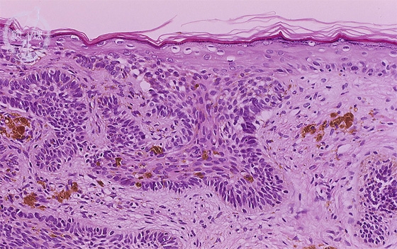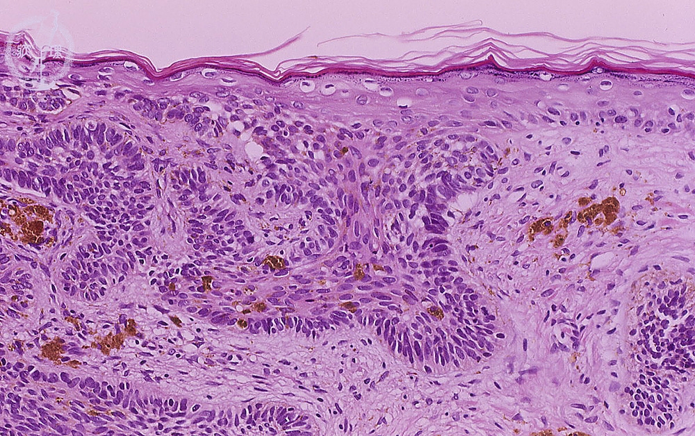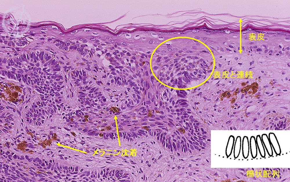 The tumor show buds attached to the epidermis. The tumor cells have oval nuclei and high nuclear to cytoplasmic ratio. The nests of tumor cells show peripheral palisading. Melanin depositions are also seen inside and near the nests.