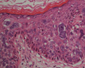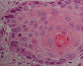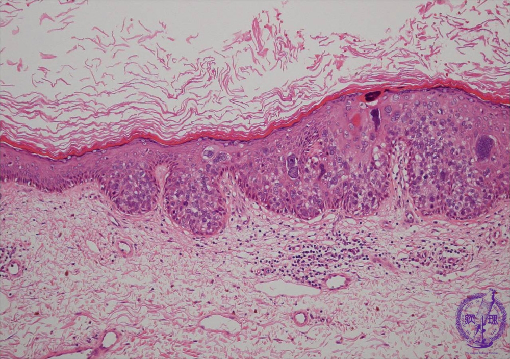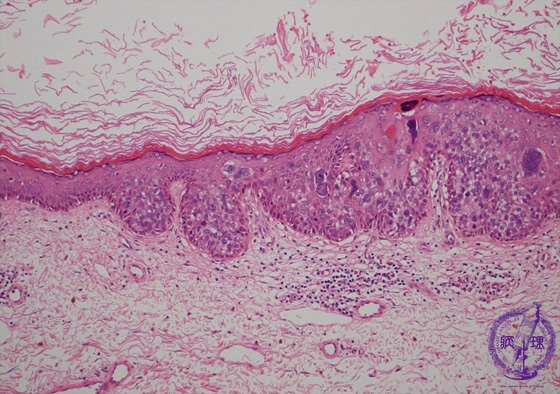 Microscopic findings: Bowen’s disease is one of the intraepidermal squamous cell carcinoma. It sometimes occurs with other internal malignancies.