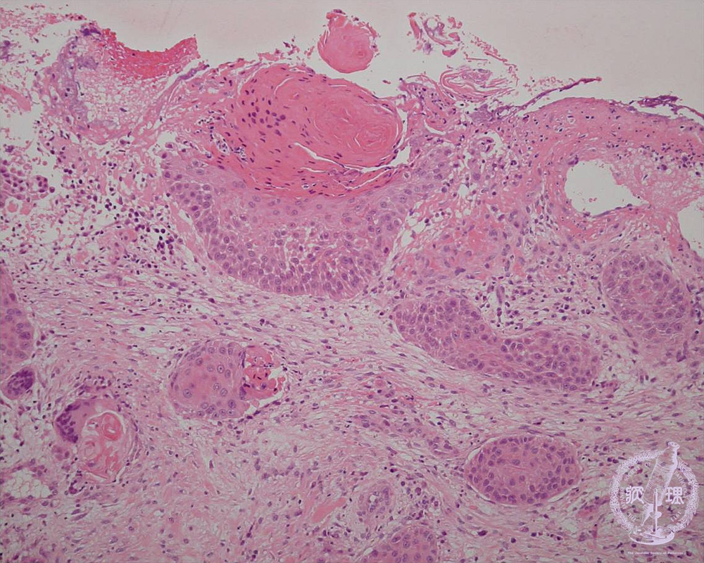 Squamous cell carcinomas arise from squamous cells of the skin. In this case, the tumor shows dermal invasion.