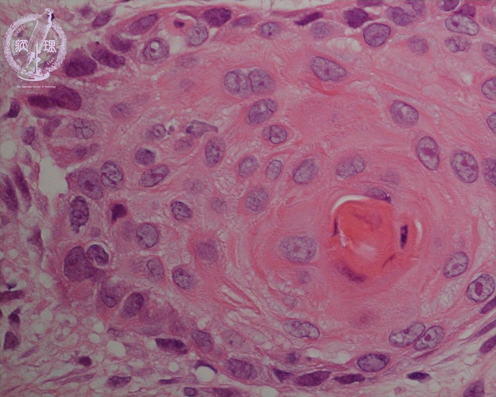 Keratinization and intercellular bridge are characteristic of squamous cell carcinomas. Keratinization is sometimes appears like a cut-surface of an onion (cancer pearl).