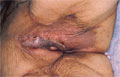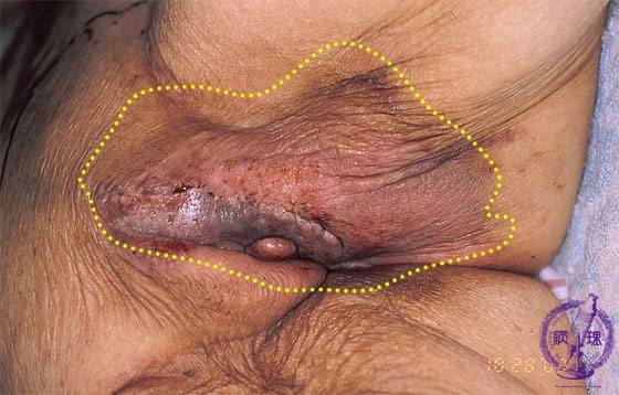 Macroscopic findings: Among Japanese patients, the tumor affects more frequently men with a male to female ratio of between 2:1 to 3:1. Most commonly the tumor spreads from the genital area (in the illustrated case vaginal lip) to the surrounding skin (in the illustrated case pubic mound). In its structure it resembles the mammary gland.