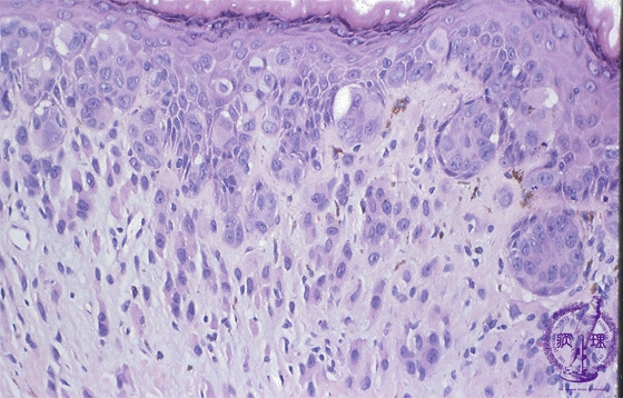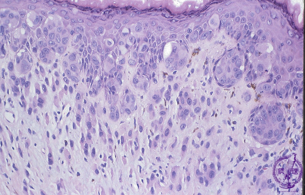 Microscopic findings: Paget cells spread within the epidermis and epithelium of the sweat ducts. Some Paget cells also invade the dermis.
