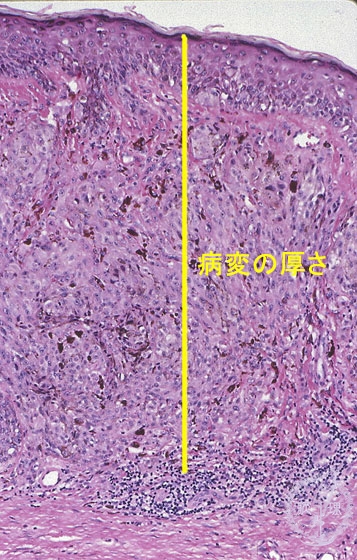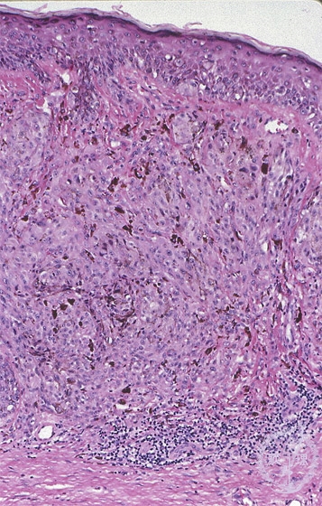 Microscopic findings: Primary lesions show intraepidermal spread. Tumor cells usually have melanin pigments which is reflected in a macroscopic black color. Characteristic of these lesions and different from benign melanocytic nevus melanin pigmentation is also seen in the deep (distal to skin surface) area.