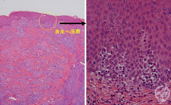 Microscopic findings: In advanced stage (tumor stage), lymphoma cells are diffusely seen in the dermis with epidermotropism (inside the circle).
