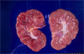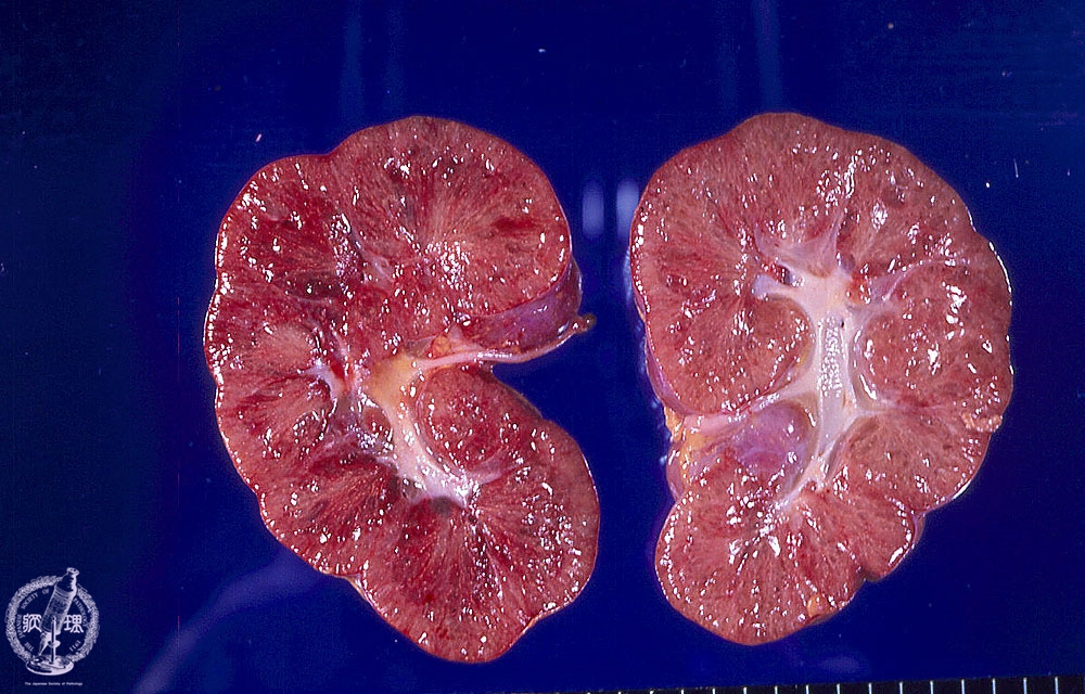 Macroscopic view; The kidney is enlarged. On cut section, numerous small cysts give the kidney a sponge-like appearance. As kidney function in utero is decreased this results is lower than normal production of amniotic fluid (oligohydramnios) which can have further consequences on fetal development (Lung hypoplasia, Potter sequence in the neonate)