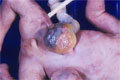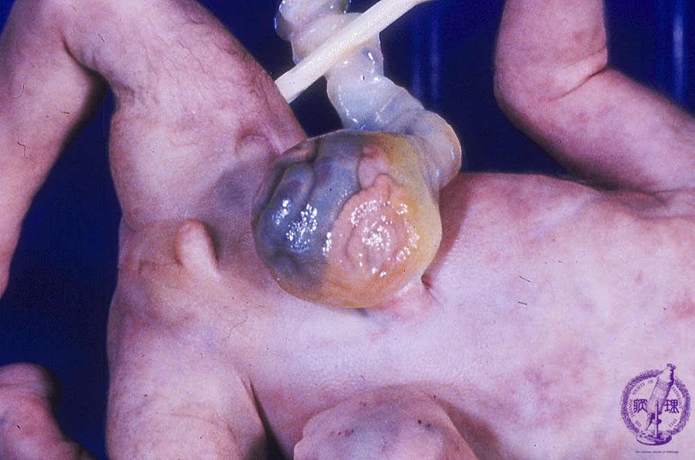 Macroscopic view; The intestine is outside of the abdominal cavity and is covered by a sac composed of amniotic membrane. It suspected to be a teratogenic defect preventing return of the physiologically herniated midgut into the abdominal cavity during the first trimester (5-10 weeks). Other major congenital anomalies are found concurrently in 30-50% of cases, including intestinal malrotation, or Meckel diverticulum