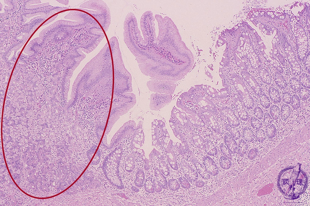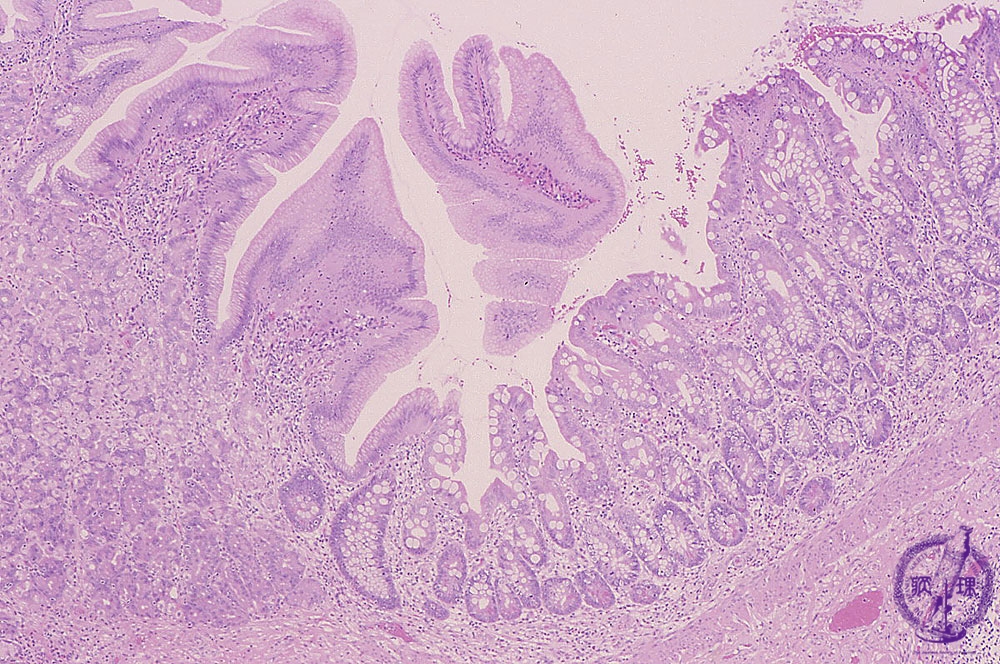 Microscopic view, low power; The inner lumen of the diverticulum. The diverticulum was lined by mucosa resembling that in the ileum and the stomach.