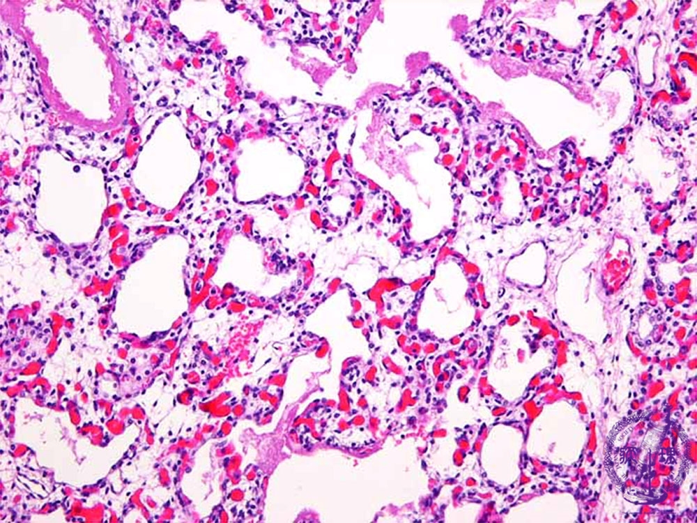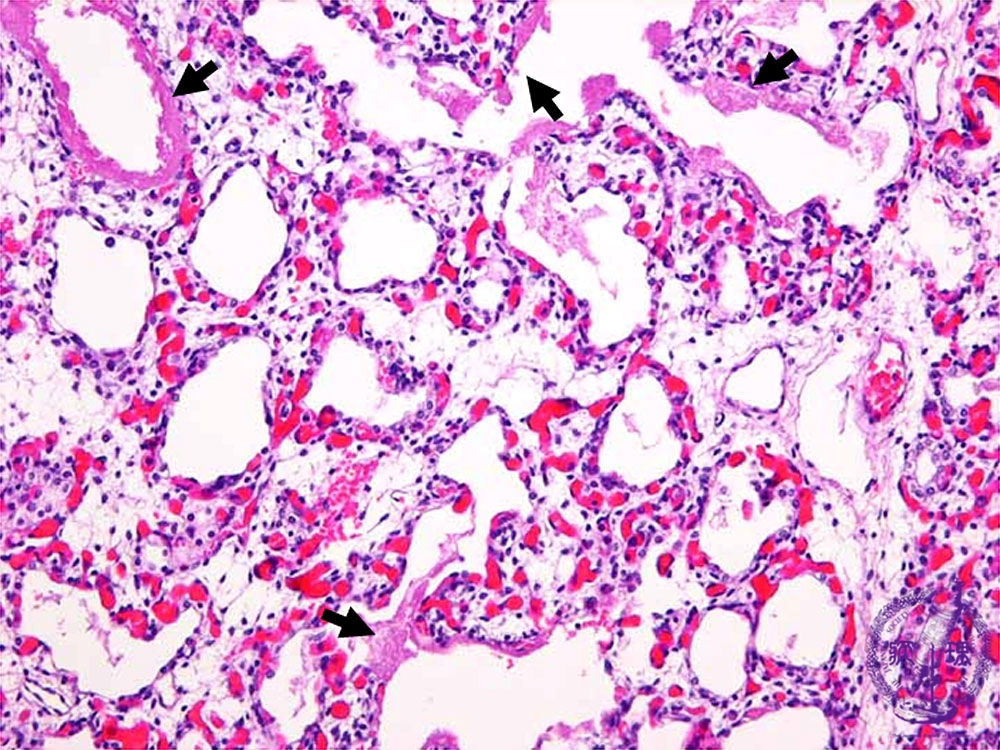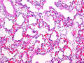 Microscopic view (H&E); The air spaces are lined by an irregular layer of homogenous, finely granular eosinophilic material. It is most commonly seen in premature infants (less than 34 weeks gestation) who are deficient in alveolar surfactant. The alveolar ducts are diffusely lined by hyaline membrane composed of fibrin with necrotic epithelial cells. The alveolar epithelial cells and bronchiolar epithelium are injured and necrotic. The administration of exogenous surfactant at birth is very effective, and it is now uncommon for premature infant to die from RDS.