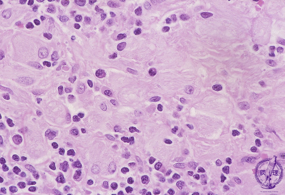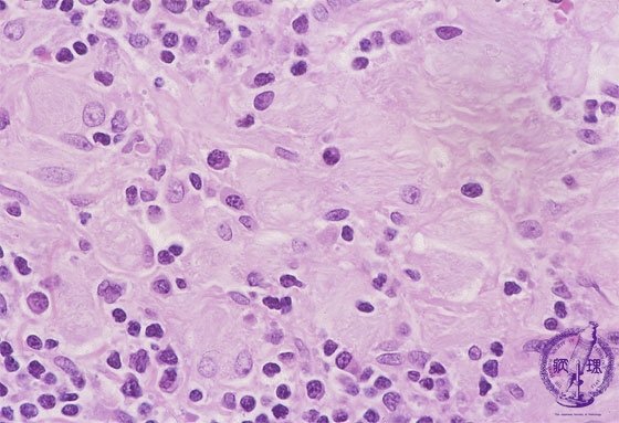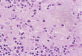 Microscopic view, high power, (H&E); In the absence of beta-glucocerebrosidase, glucocerebroside cannot be catalytically converted into ceramide and glucose and thus it accumulated in histiocytes (lysosome).These histiocytes take on a large vacuolated appearance and are termed Gaucher cells. These are seen in bone marrow, liver, spleen and lymph node with striated cytoplasm (often described as resembling wrinkled tissue paper)