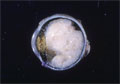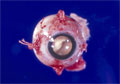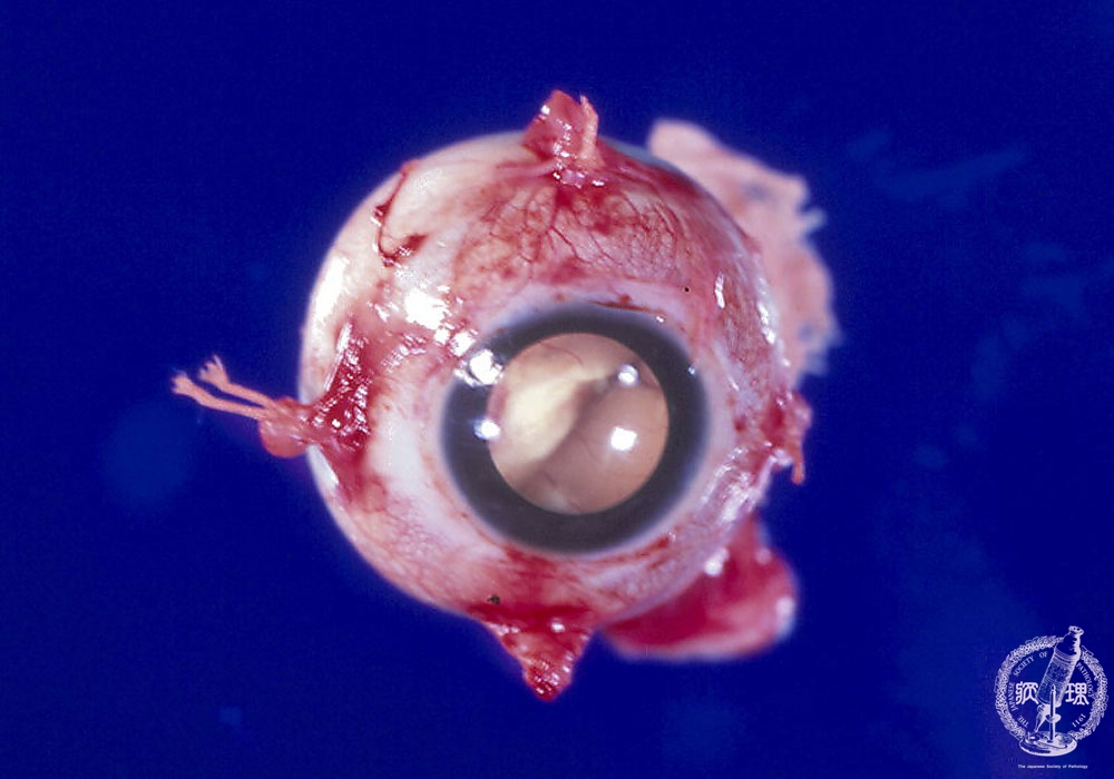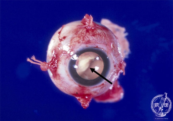 Macroscopic view; The enucleated eye. A white solid tissue in the vitreous cavity comprising the tumor can be seen through the dilated pupil (arrow). This white reflective effect is termed Leukocoria/cat’s eye reflection
