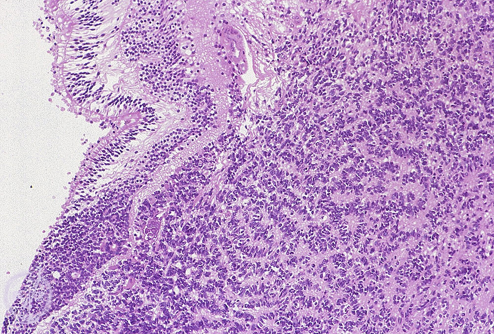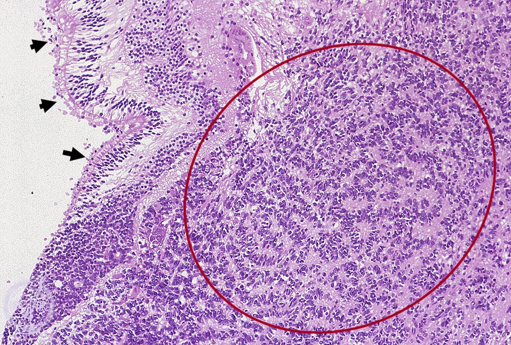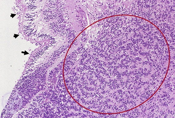 Microscopic view (H&E, low power) A white mass arises from the retina (arrows), was composed of hyperchromatic small round cells with high N/C ratio (Circle). Flexner-Wintersteiner Rosettes are seen.