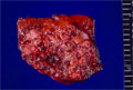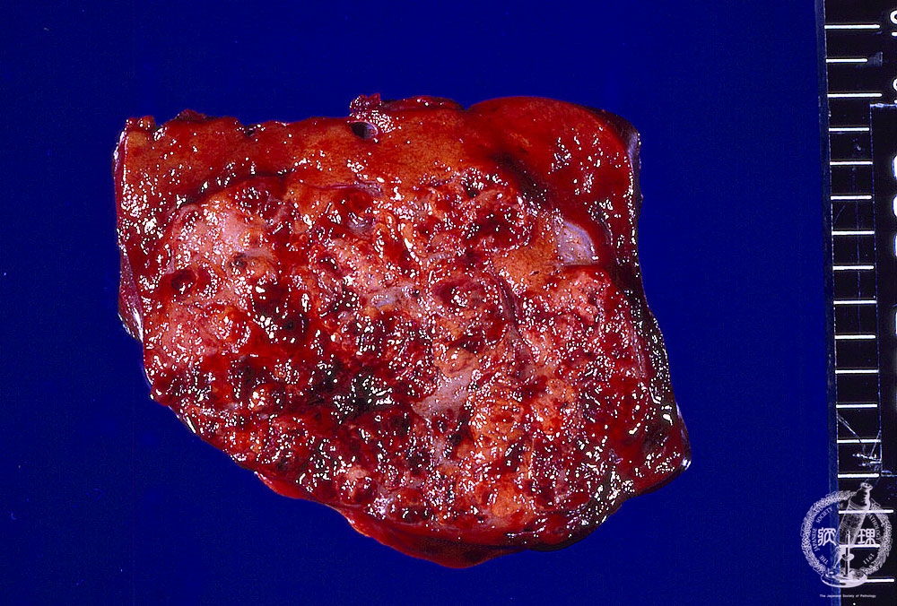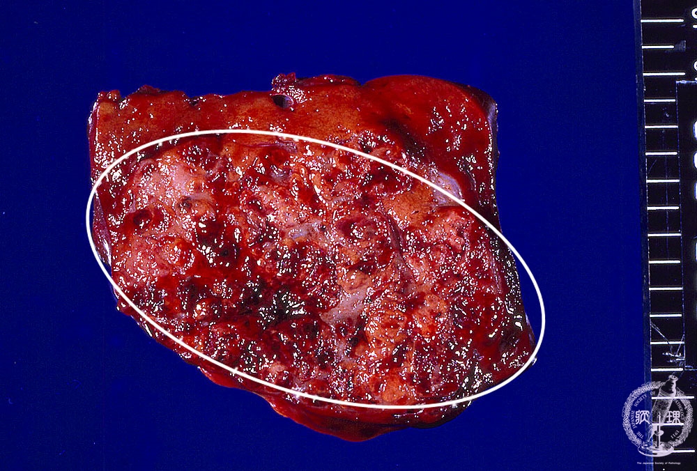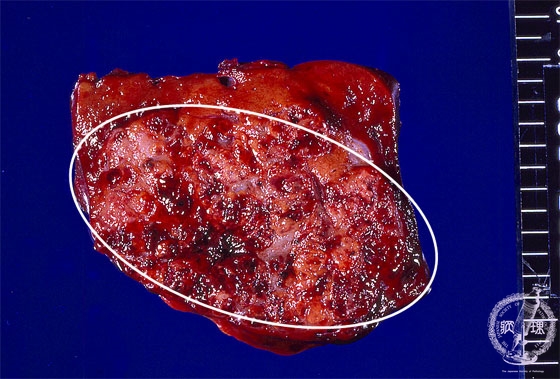 Macro; It is the most common liver tumor of young childhood. Like hepatocellular carcinoma in adults, hepatoblastoma also produce alfa-fetoprotein (AFP). Tumors have areas of necrosis, cystic softening and hemorrhage (circle).