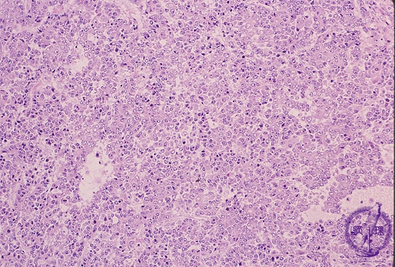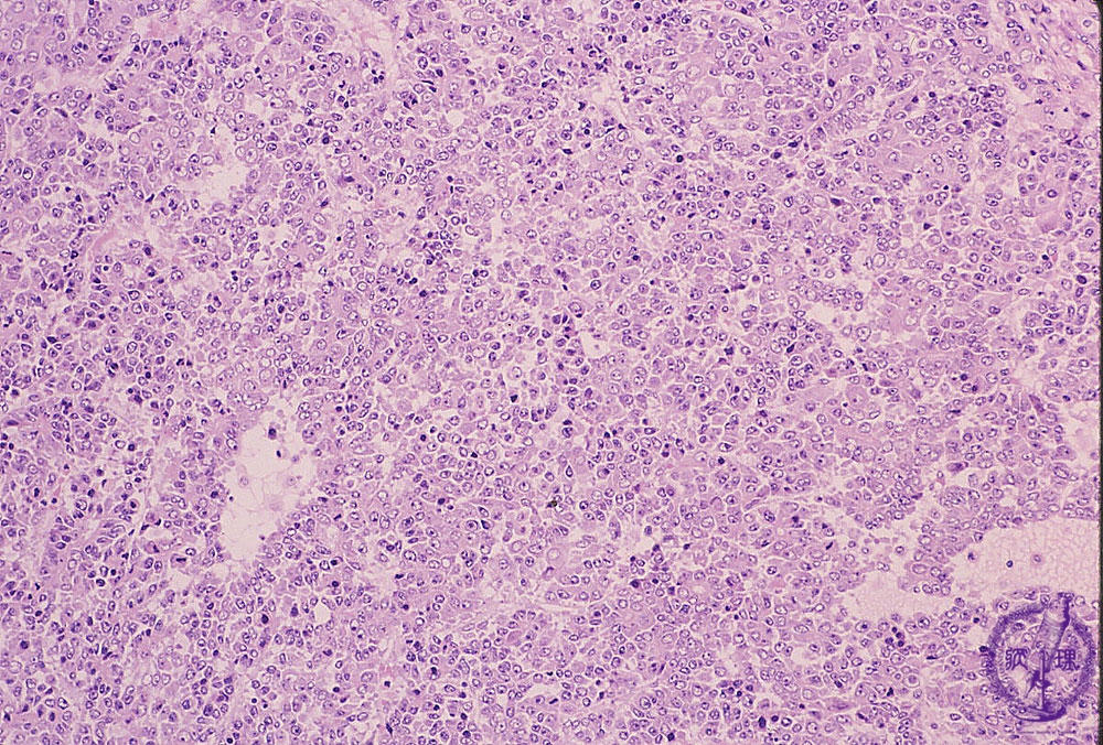 Microscopic view H&E; The tumor composed of hyperchromatic, round nuclei with large nucleoli, and high N/C ratio (poorly differentiated/ embryonal type). It showed a trabecular pattern. There are many examples of mitosis and karyorrhexis.