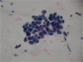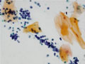 Smear of sputum (Papanicolaou stain, Medium power) The cytoplasm of tumor cells is large in size and irregularly round in shape. The cytoplasm is eosinophilic or stained with Orange G. with squamous cell carcinoma located in the hilus of the lung the number of cells is many leading to a better chance of diagnosis from sputum smear.