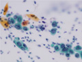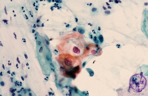 Mild dysplasia, CIN1, LSIL(Papanicolaou staining, high magnification). In normal women of childbearing age, the superficial cells are usually eosinophilic and show small condensed nuclei. The orange cells, stained by orange G, have large cytoplasm with discorded enlarged nuclei.The cells showed perinuclear clear zones or halos (koilocytosis).Koilocytosis are a pathognomonic feature of Human papilloma virus infection.